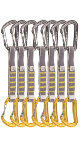 CAMP most sophisticated quickdraw for sport climbing at the highest level. The Dyon Mixed Express KS utilizes the tried and true Photon straight gate carabiner on the bolt end and the Dyon KeyWire carabiner on the rope end. The Dyon uses a proprietary two-part gate to combine the benefits of smooth wire gate action with a keylocking closure. This unique combination gives it both high levels of performance and safety. The curved I-Beam construction on the spine keeps the weight to a minimum while providing a high level of rigidity and an incredible open gate strength of 11 kN. The proprietary SphereLock closure is an upgrade to the traditional keylock system with an even cleaner nose profile. The Dyon Mixed Express KS also uses CAMP most sophisticated dogbone with variable width webbing that makes them easy to grab while projecting sport routes and the proprietary Karstop Evo carabiner retainer on the rope end. Available in 11 cm and 18 cm lengths.