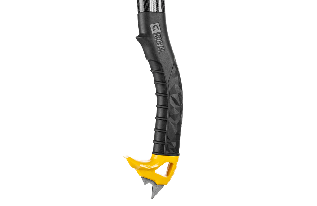 The G-Bone carbon composite shaft has an ergonomic shape that can be gripped anywhere along the length of the shaft. The material doesn't conduct cold the way metal does and has the rigidity to hack into boilerplate ice. Shaped for alpine use, the shaft can be plunged, but has a good swing weight and sticks nice and snappy on steeper ice.