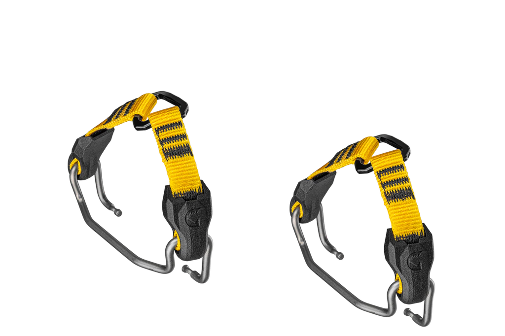 Front bail that allows you to adapt Grivel Cramp-O-Matic crampons to mountaineering boots that don’t have toe welts.